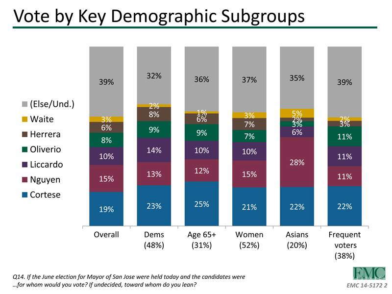 In the upcoming primary election, it will take only about 23% of the vote to advance to the general election, and Cortese already has a commanding overall lead with 19%.  Equally important, the poll shows him leading with all but one major demographic group.  Cortese leads with older voters, younger voters, Democrats, Republicans, Hispanics, men and women.  Madison Nguyen trails with 15% and Sam Liccardo, who just admitted committing fundraising violations, has support from just 10% of voters.  Nguyen has a narrow lead over Cortese with Asians, but voters do not know Liccardo, and he has no base of support.  Both Nguyen and Liccardo have a steep uphill battle.