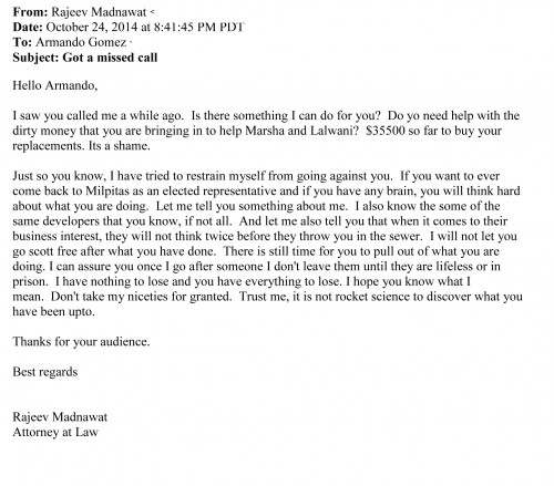 What could possibly have set off that kind of venom?  Outside his law practice, Madnawat is a Milpitas Planning Commissioner (more about him here) He is running against Grilli and Lalwani for one of two open seats on the council.  But just to prove there are no hard feelings, he signs the threatening letter: “Best Regards.”