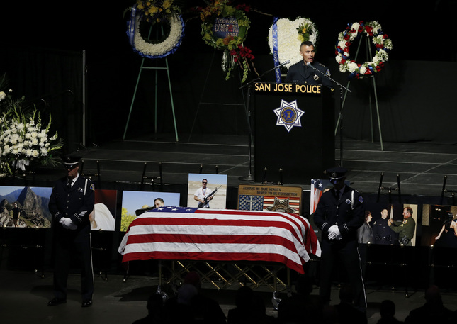 Thousands of law enforcement officers from throughout the State of California, and some from out of state, paid tribute to San Jose Police Officer Michael Johnson in a moving tribute at SAP center. An hour long procession from a Los Gatos funeral home, through Campbell and into downtown San Jose included dozens of police agency cars and motorcycles escorting the hearse carrying Johnson’s body. Bystanders lined the streets along the route to pay tribute to the fallen officer who was shot and killed in the line of duty March 24.